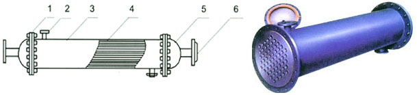 | 1.法 蘭 2.進(jìn)出口節(jié)管 3.殼 體 4.列 管 5.封 頭 6.進(jìn)出口管 |